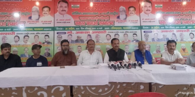 लखनऊ। मोमिन अन्सार सभा के राष्ट्रीय अध्यक्ष मो. अकरम अन्सारी ने अवगत कराया कि मोमिन अन्सार सभा का मोमिन अन्सार समाज , बुनकरो, दस्तकारों सहित, पिछड़े, दलित , पसमान्दा मुसलमानो का 16 वॉ राष्ट्रीय पसमान्दा समाजी , सियासी वक़ार बचाओ सम्मेलन दिनाँक 26 अप्रैल 2026 दिन रविवार को रविंद्रालय , चारबाग़ लखनऊ मे सुबह 10 बजे से मोमिन अन्सार सभा के राष्ट्रीय अध्यक्ष मोहम्मद अकरम अन्सारी की अध्यक्षता मे होगा। सम्मलेन मे उत्तर प्रदेश के सभी ज़िला , नगर , कस्बे सहित बिहार , उत्तराखंड , झारखण्ड , दिल्ली , महाराष्ट्र , राजस्थान, मध्य प्रदेश , प. बंगाल , आदि प्रदेशो से मोमिन अन्सार सभा के प्रतिनिधि व समाजिक संगठनों के पदाधिकारी , समाजसेवी शामिल होंगे ,मोमिन अन्सार सभा के बैनर तले उत्तर प्रदेश के कोने कोने सहित पंद्रह प्रदेशो मे मोमिन अन्सार समाज , पसमान्दा समाज सहित दस्तकार रोज़गार , शिक्षा , सुरक्षा, राजनैतिक भागीदारी लेने के लिये एक जुट हुआ है । सम्मेलन में अन्सारी समाज के साथ पसमानदा मुसलमान बड़ी संख्या में पहुचकर अपने मान सम्मान अधिकार की लड़ाई को आसान बनाएंगे। सम्मेलन में पूर्व की तरह विभिन्न क्षेत्रों में अच्छा कार्य करने वाली विभूतियों को सम्मानित किया जायेगा