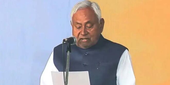 पटना । नीतिश कुमार ने 10वीं बार बिहार के मुख्यमंत्री पद की शपथ ले ली । बिहार में एनडीए की नई सरकार के शपथ ग्रहण समारोह के लिए प्रधानमंत्री नरेंद्र मोदी पटना के गांधी मैदान पहुंचें । पीएम मोदी के अलावा गृह मंत्री अमित शाह, बीजेपी के राष्ट्रीय अध्यक्ष जेपी नड्डा भी मंच पर नज़र आए।
