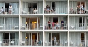 हवाई द्वीप पर छुटिटयां बिताते लोग अपने होटल की बालकनी से बाहर देखते हुए