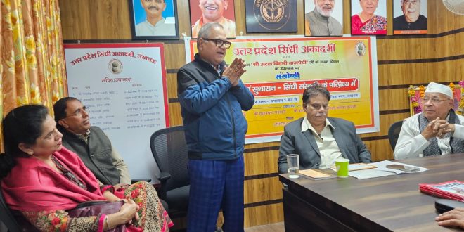 लखनऊ: उत्तर प्रदेश सिंधी अकादमी द्वारा भारत रत्न श्री अटल बिहारी वाजपेयी के जन्म शताब्दी वर्ष के अन्तर्गत आज दिनांक 26 दिसम्बर, 2024 को ’’अटल जी एवं सुशासन-सिंधी संस्कृति के परिप्रेक्ष्य में’’ विषय पर संगोष्ठी का आयोजन अकादमी कार्यालय, इन्दिरा भवन, लखनऊ में किया गया। कार्यक्रम में सर्वप्रथम श्री नानक चन्द लखमानी, पूर्व उपाध्यक्ष, उ0प्र0 सिंधी अकादमी, श्री दुनीचन्द, सिंधी विद्वान, श्री प्रकाश गोधवानी, डॉ0 अनिल चन्दानी तथा श्रीमती कनिका गुरूनानी द्वारा भगवान झूलेलाल की प्रतिमा पर माल्यार्पण कर कार्यक्रम का शुभारम्भ किया गया।